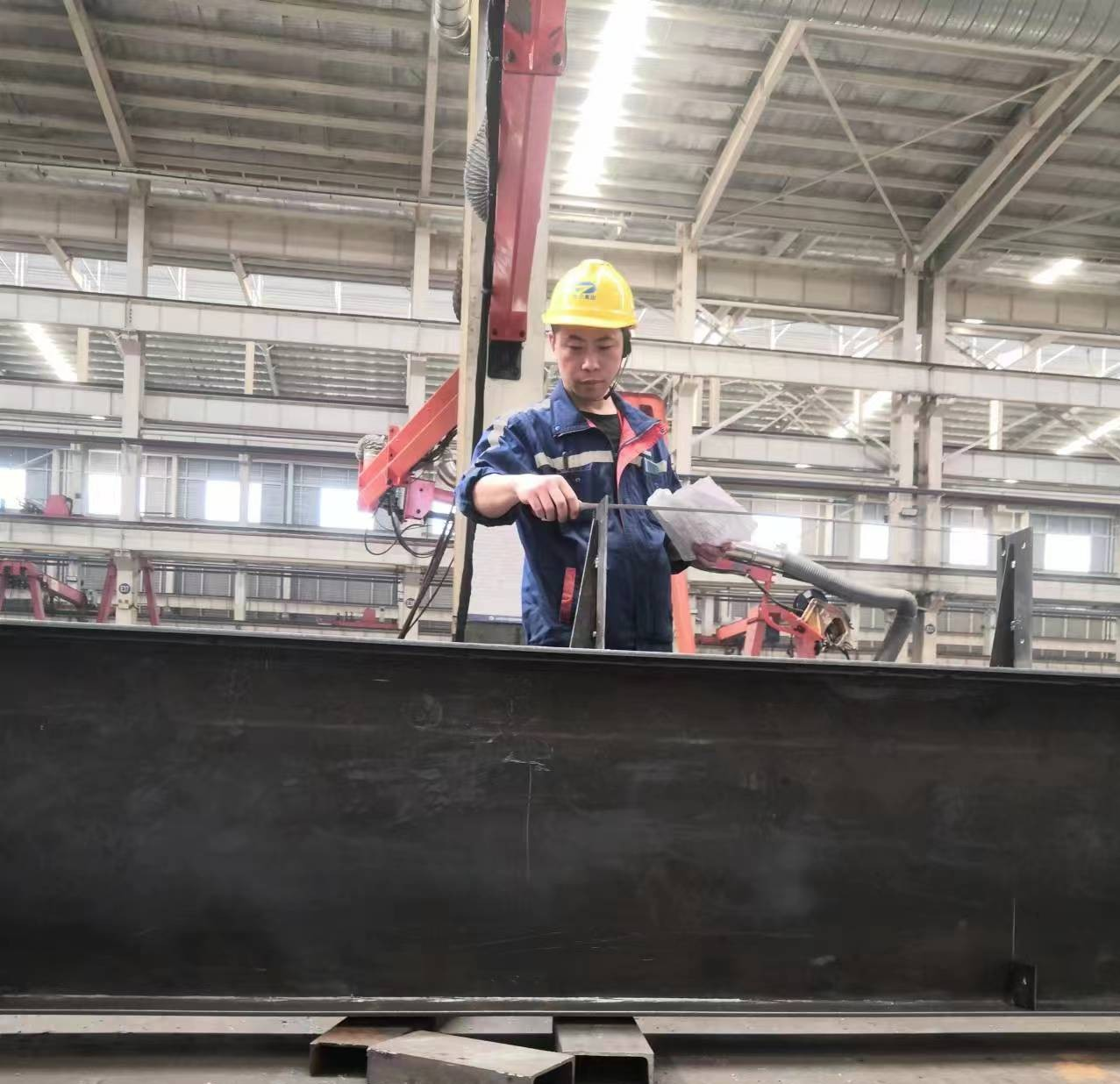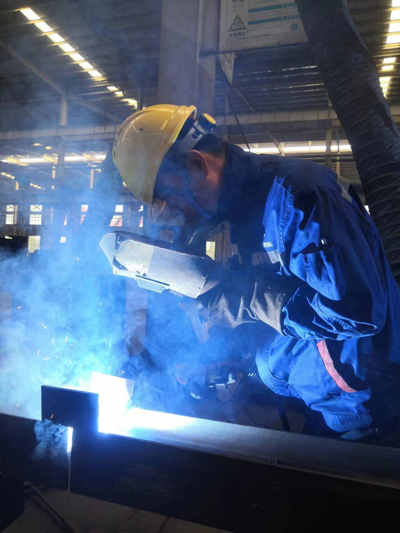 2020年,公司承接了“浪潮•青岛大数据中心”项目的生产加工任务。该项目结构复杂、加工周期短。他带领班组人员不畏劳苦、奋勇争先,啃最难啃的骨头,负责加工核心筒区域的全部构件。该区域的钢柱板材厚、截面小、尺寸长、焊缝质量要求一级。因为截面太小,给焊接操作的空间带来很大不便,甚至焊枪都无法完全伸进去,焊接工人更是无法运弧、摆弧。一时间,焊接工作陷入停滞不前的状态。黄振东十分着急,带领班组人员不断摸索各种焊接工艺,对这一问题深入探讨并不断尝试各种焊接手法。经过两天的不停摸索,黄振东将第一件钢柱终于焊接完成。但是,因为钢柱翼腹板太厚,整根钢柱扭曲变形特别严重,常规火校无法消除变形应力,只能再次刨开,重新改变焊接工艺重新焊接。为解决这一问题,他连同技术科共同组成攻关小组,前后利用5天时间深入分析、反复实验,最终决定采取腹板打V型坡口留3-5毫米间隙,双侧同时打底的焊接办法,这样既解决了一级全熔难题,同时也解决了因单侧打底施焊、背面气创清根造成的翼板变形,以及内部应力无法消除的难题。